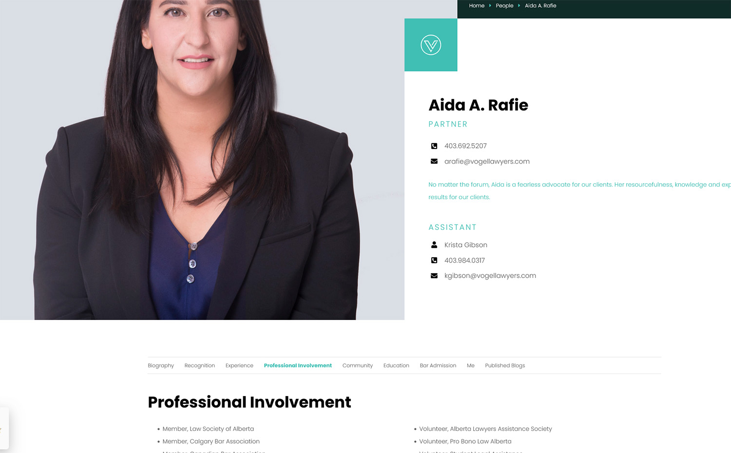 Another good way to present a lot of information in a neat and tidy format is to use tabbed headers and bulleted content like the bios for Vogel Lawyers.