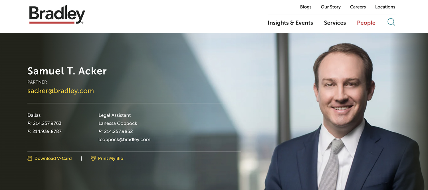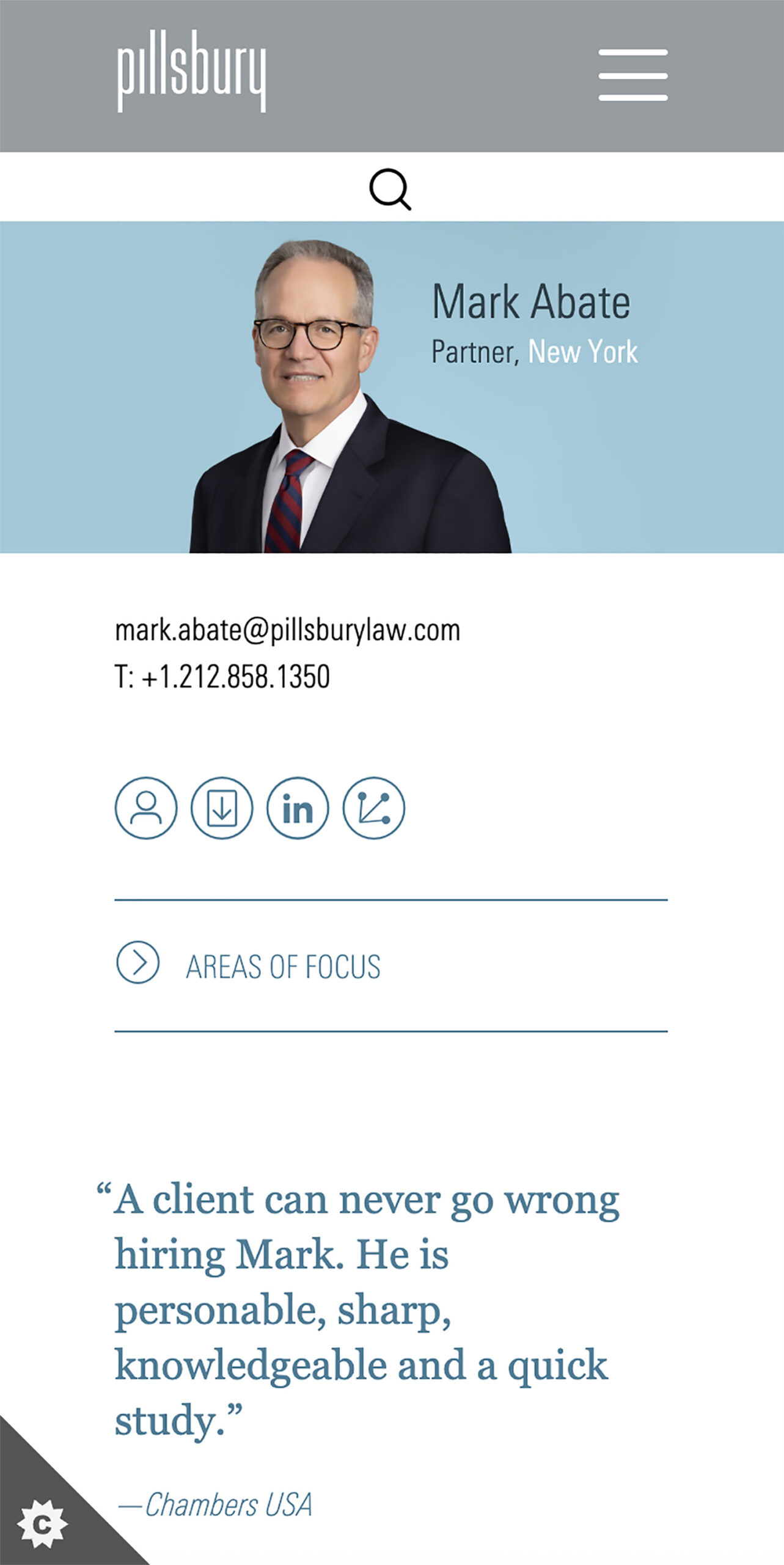 Finally, check out the design of the following bio. This is typical of the bios at Pillsbury—clean and uncluttered with a mobile-first design.