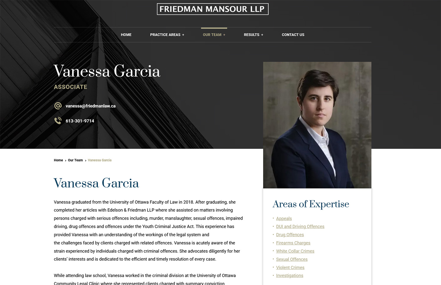 This lawyer from Friedman Mansour, a criminal law firm based in Ottawa, includess version of their bio in English, French and Spanish.