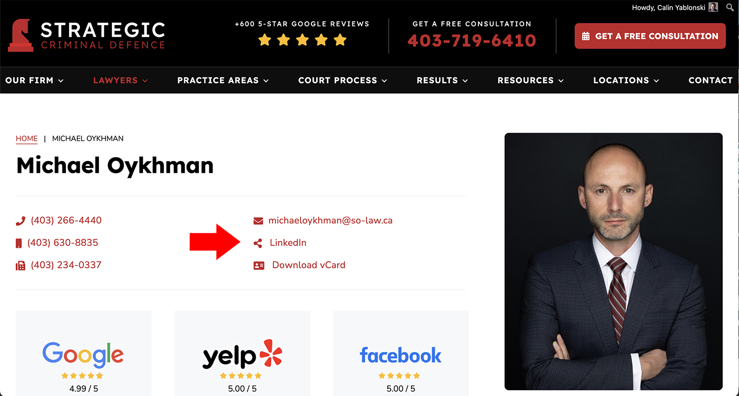 This bio from an attorney at Strategic Criminal Defence includes prominent LinkedIn profile links.