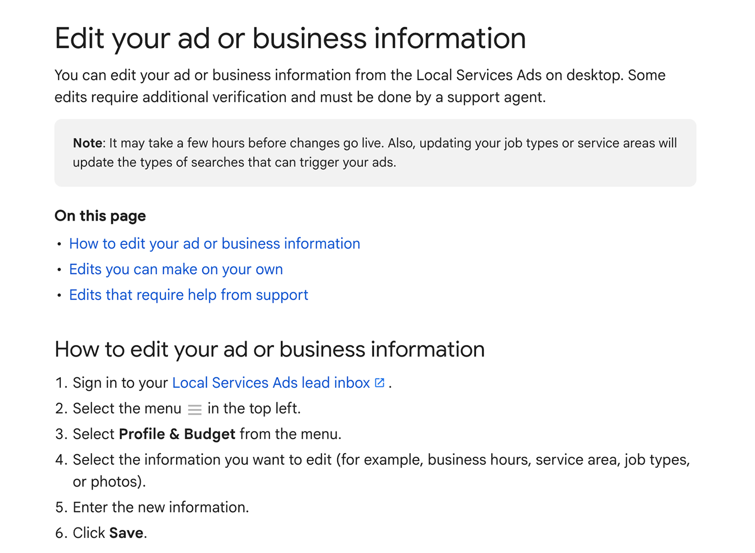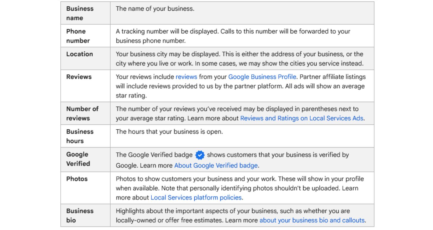 When users click on your ad, they’ll find your LSA profile. You can edit profile information at any time. This profile is different from your Google Business profile (another essential element of local search).