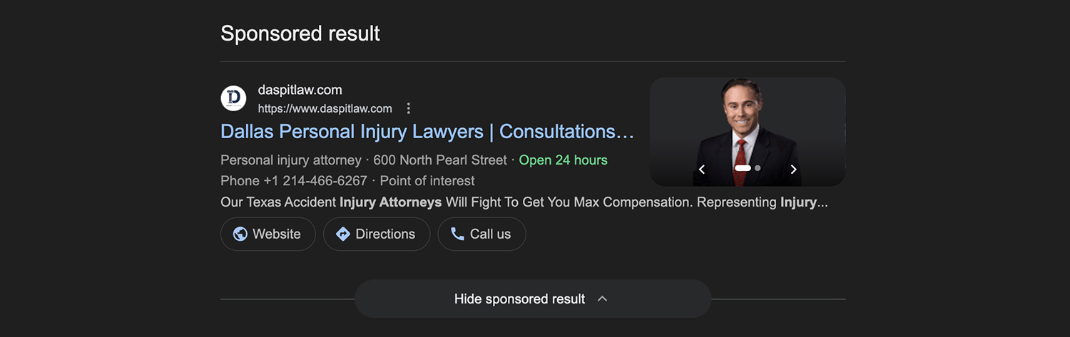 LSAs appear right at the top of the Google results page for “near me” or other location-based searches. We often hear about being “#1in Google”. Well, this is it. They appear ABOVE traditional Google Ads for lawyers.