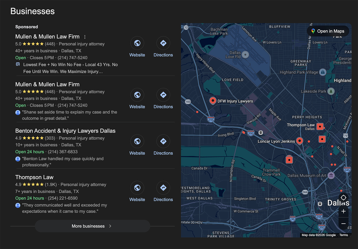 Try it on your mobile device. Type family injury lawyer near me in Google search. You’ll likely see something like this: