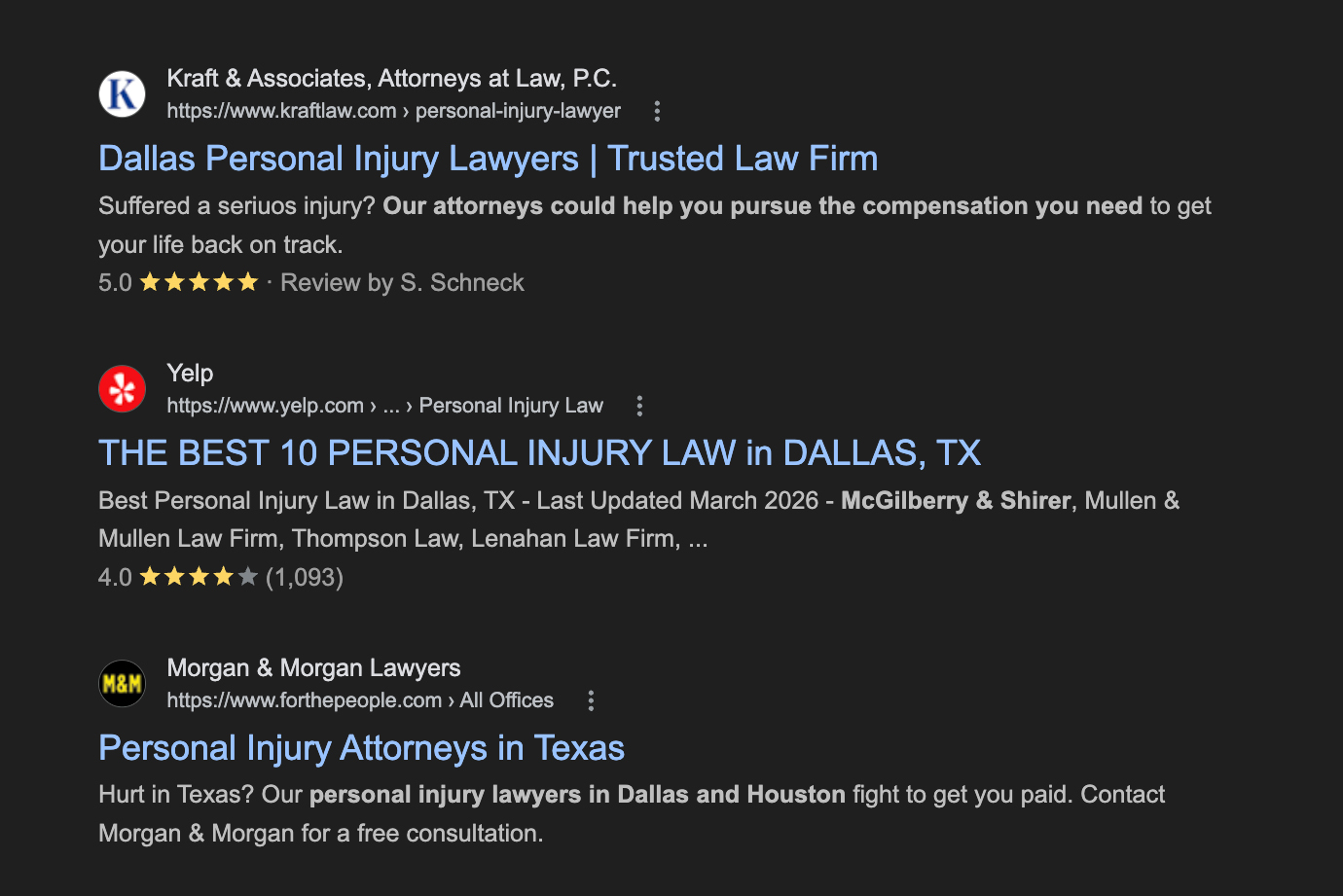 - High-intent searches where there is a pressing need to hire a lawyer.