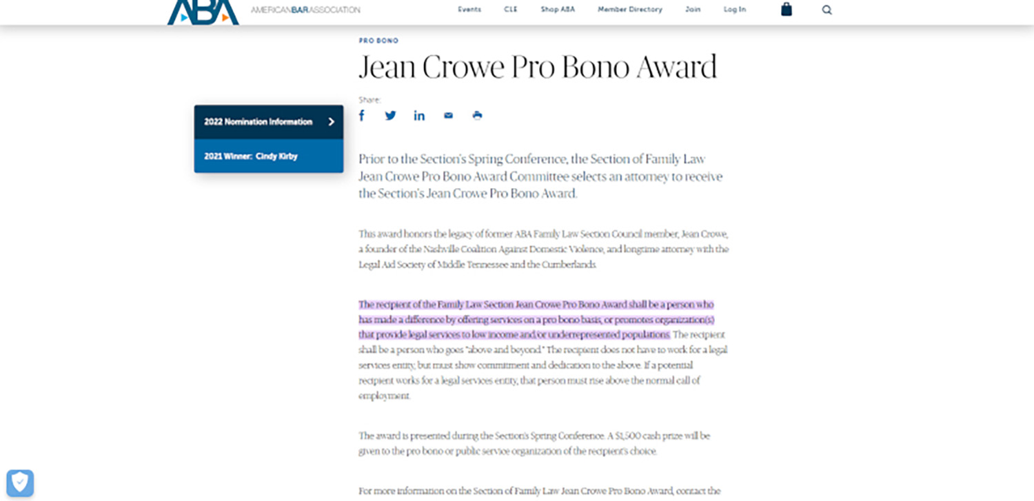 In honor of former ABA Family Law Section Council member, Jean Crowe, this award is given to someone who goes above and beyond in their work supporting low-income and underrepresented communities.