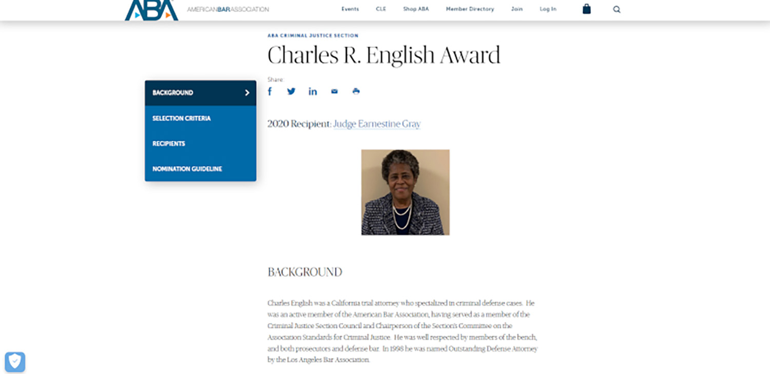 An award for those in the criminal justice field who follow the principles laid out in the ABA Standards for Criminal Justice, Defense Function. You must have contributed to the betterment of the criminal justice system.