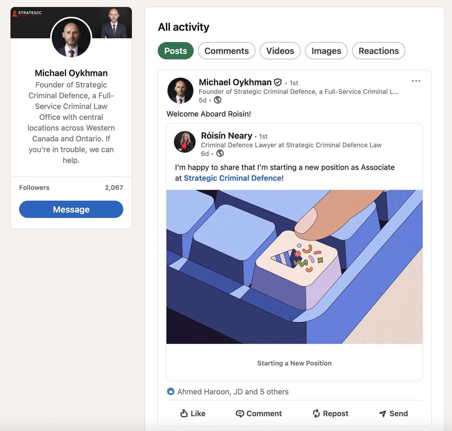 As you can see from this lawyer’s profile, all of the main activities (comments, shares, likes, etc.) are detailed in this section: