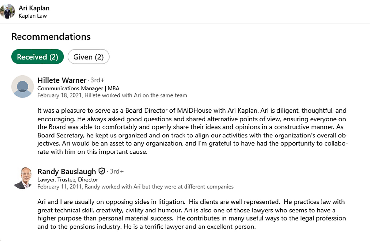 Recommendations are harder to obtain than endorsements. You need to actively seek them, and people need to write a sentence or two about you — like with a client review.