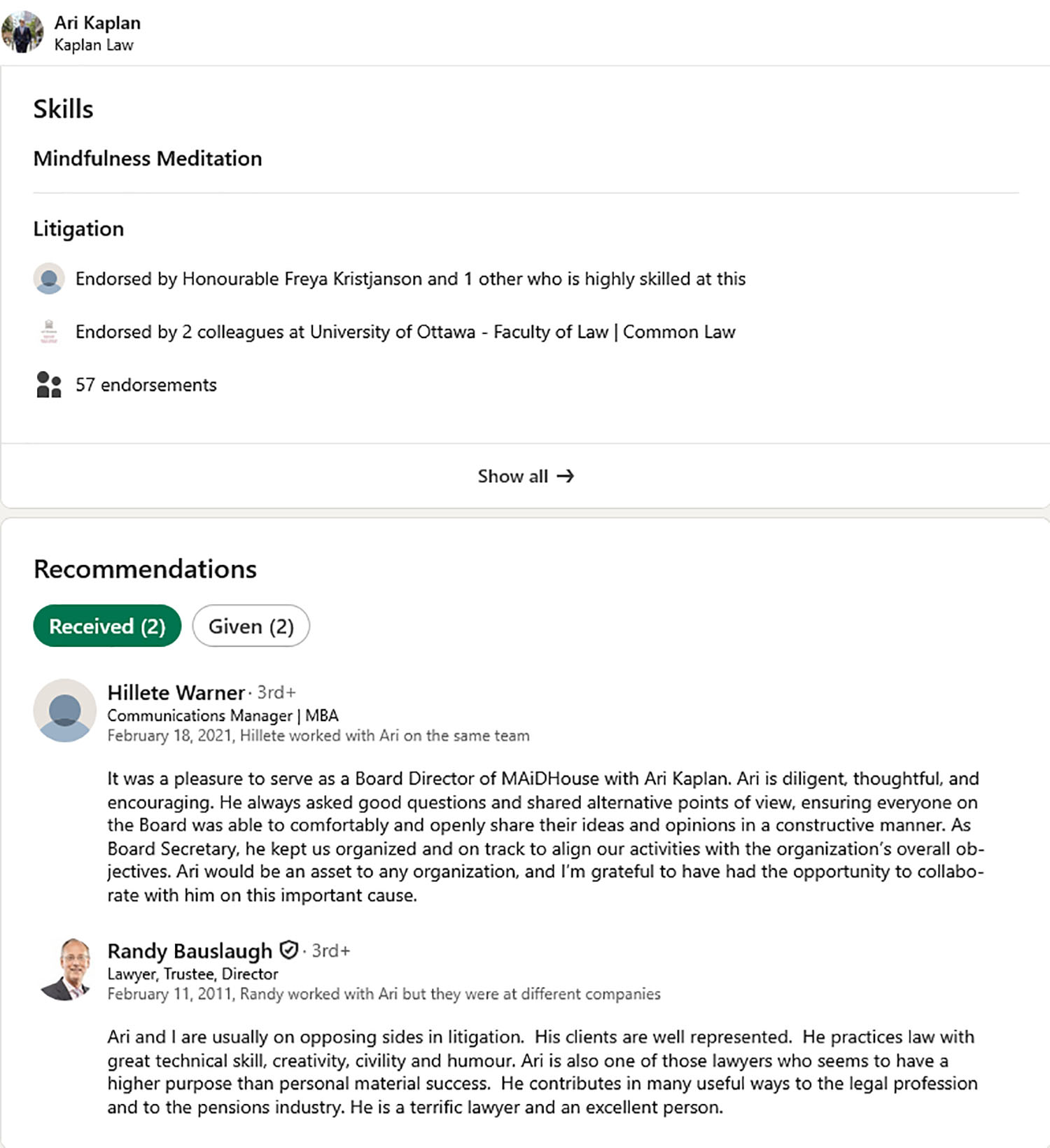 If you click on a particular skill, such as “civil litigation” in the example above, a popup window shows who has endorsed you.