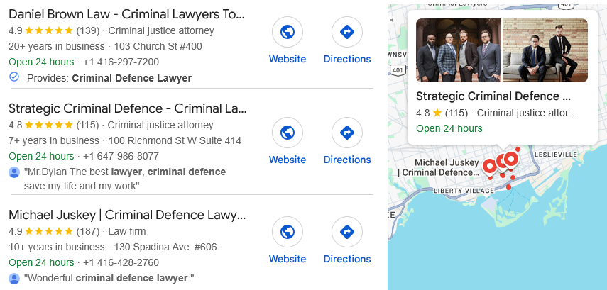 These three local results appear almost every time a user has local intent (e.g., divorce lawyer near me or criminal defence lawyer Toronto).