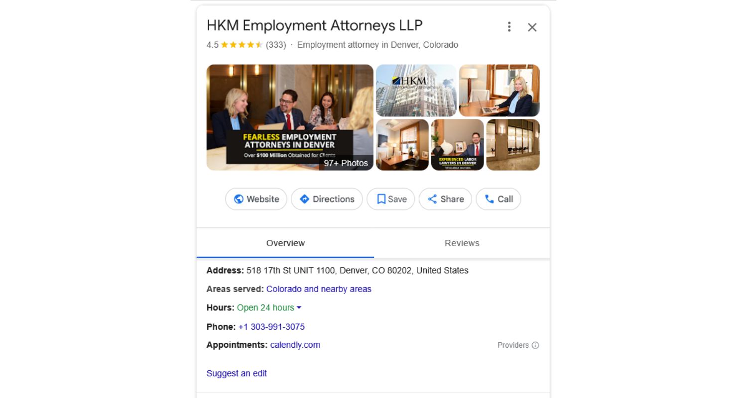 An optimized Google Business Profile remains the hub of law firm local SEO in 2026. So, a profile that looks something like this can work wonders for local lead numbers: