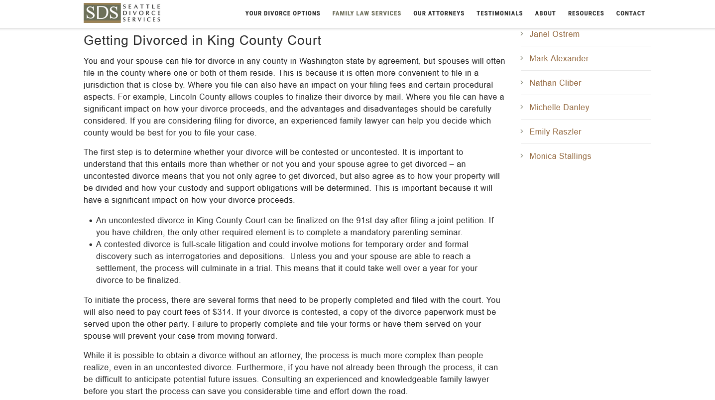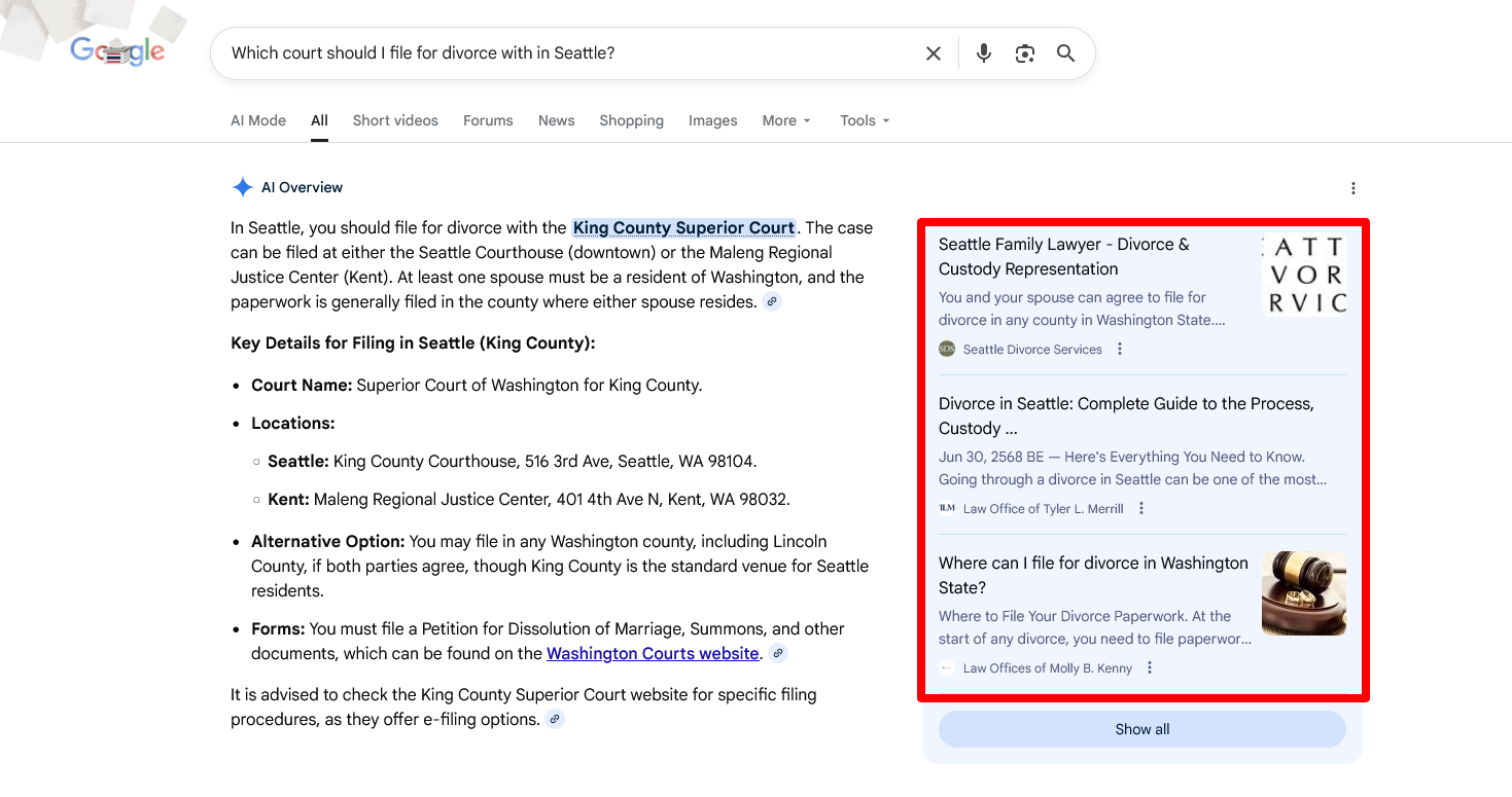 In this example, a question of which court should I file for divorce with in Seattle? returns this result: