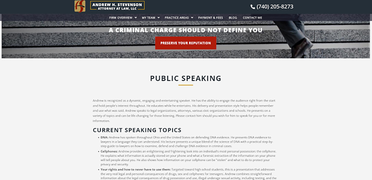 Andrew H. Stevenson, a criminal defense lawyer in Ohio, promotes his public speaking events on a dedicated page on the firm’s website.